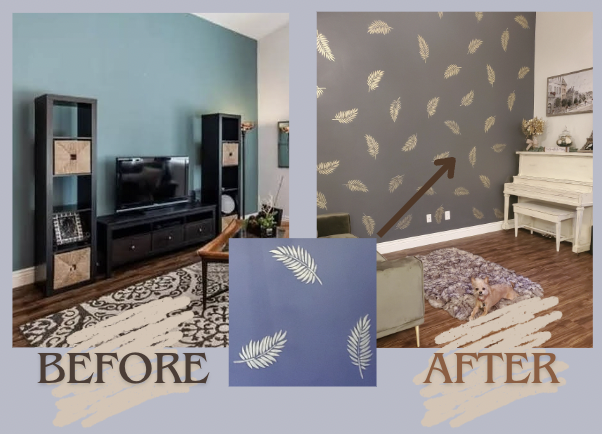 When we moved in the wall was this dated teal color. I wanted something that would make a big bold statement. First we painted large swatches in a couple colors of gray and settled on graphic charcoal. The leaves are metallic gold paint. We cut the stencil out of cardstock on our cricut machine 10 or 12 times and then after some trial and error landed on using a $1.99 sponge paint brush. Then placing, taping, sponging, moving…repeat! Surprisingly we didn’t plan out the spacing or the angles of the leaves we just randomly placed them and it turned out amazing!