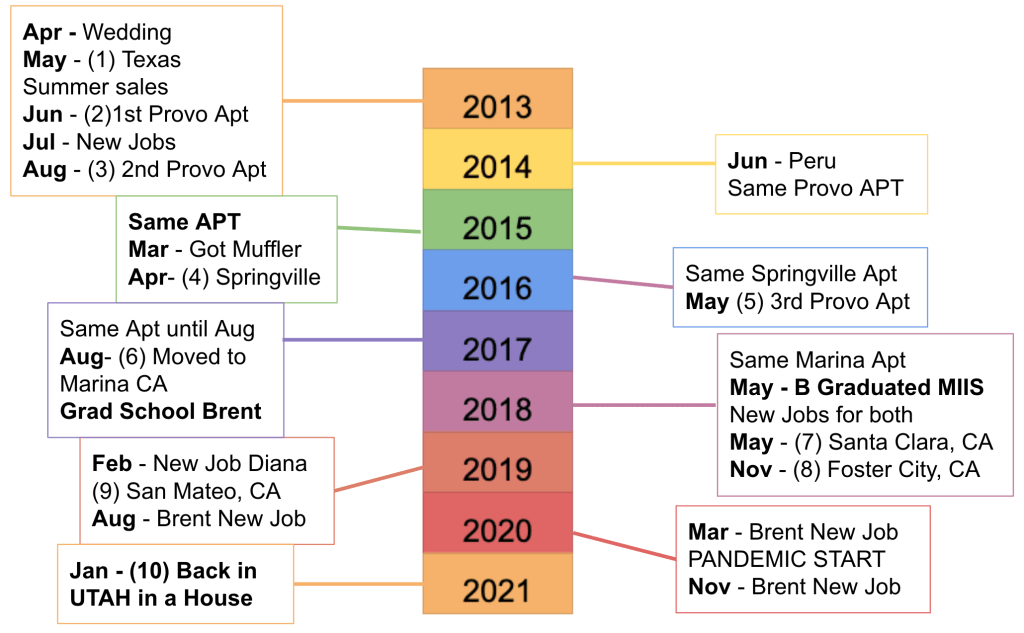 I learned a couple of things from our timeline. First: 10 moves in eight years is far too many moves. Thankfully we purchased this time around, which means we hope to stay for a while longer before moving again. Second: We have gone on far too few world adventures. We have made a few trips to other places within the United States that didn’t make it on the short timeline. Third: There are far too many jobs cluttering our resumes.